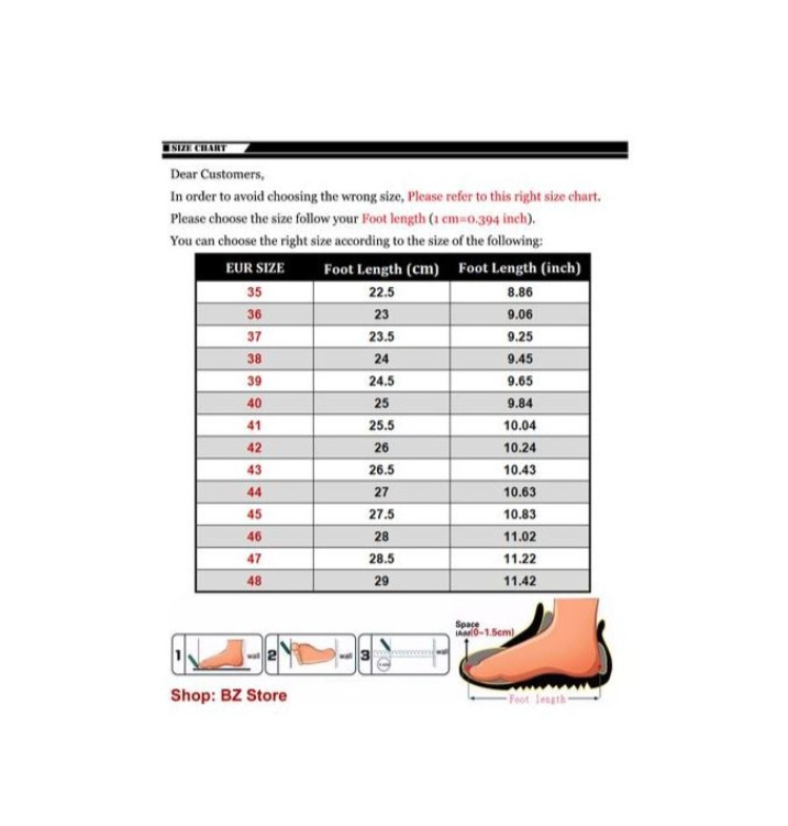 Size chart--- Men Size (38-48)  ---Women Size(35-42)