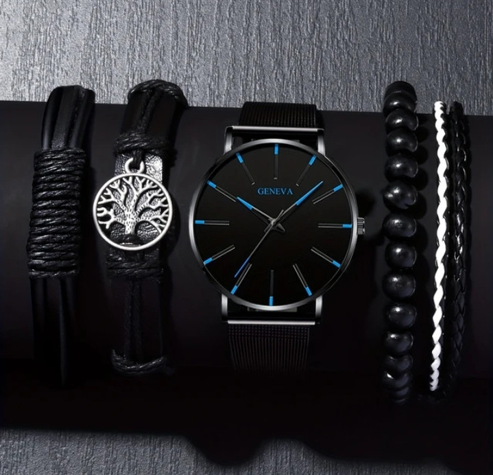 1pc Black Fashion Men's Quartz Watch & 4pcs Black Tree Of Life Bracelet Set Quality set